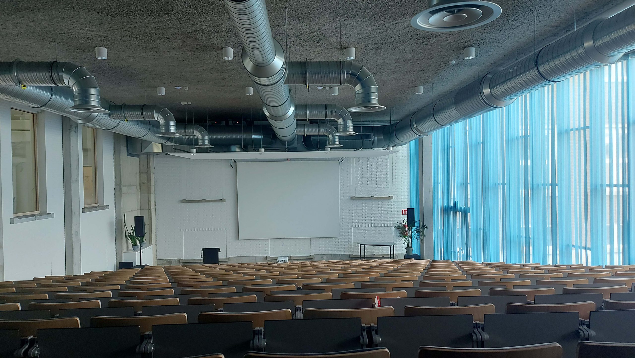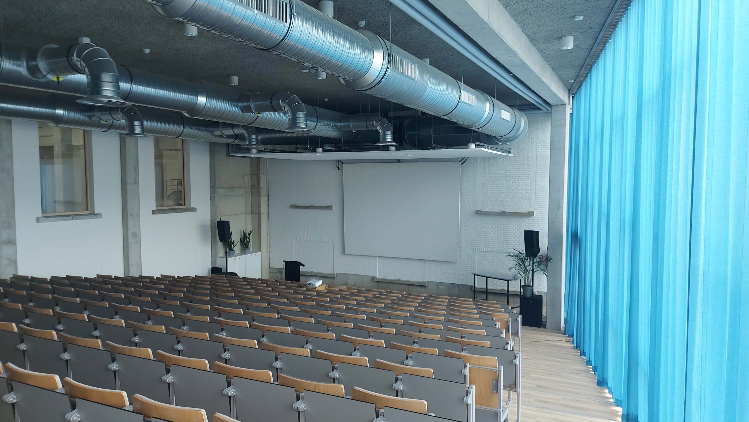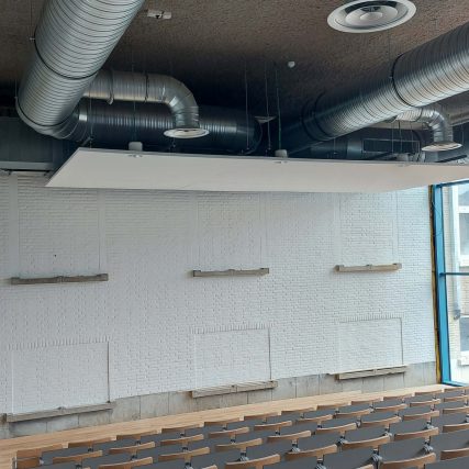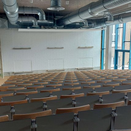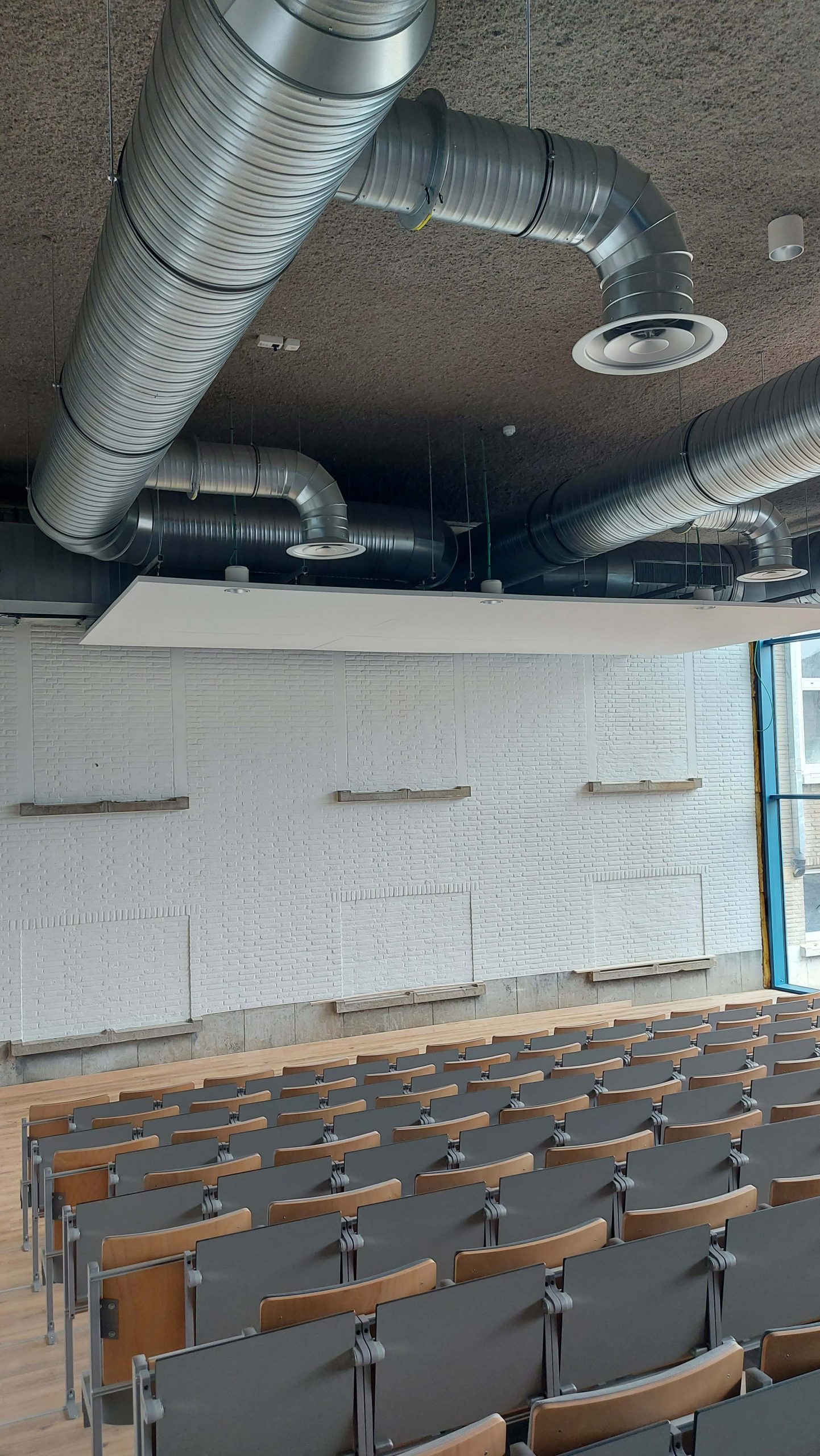 Voor het auditorium werd van de Kindsheid Jesu school werd een industrieelgrijze spuitpleister voorzien.