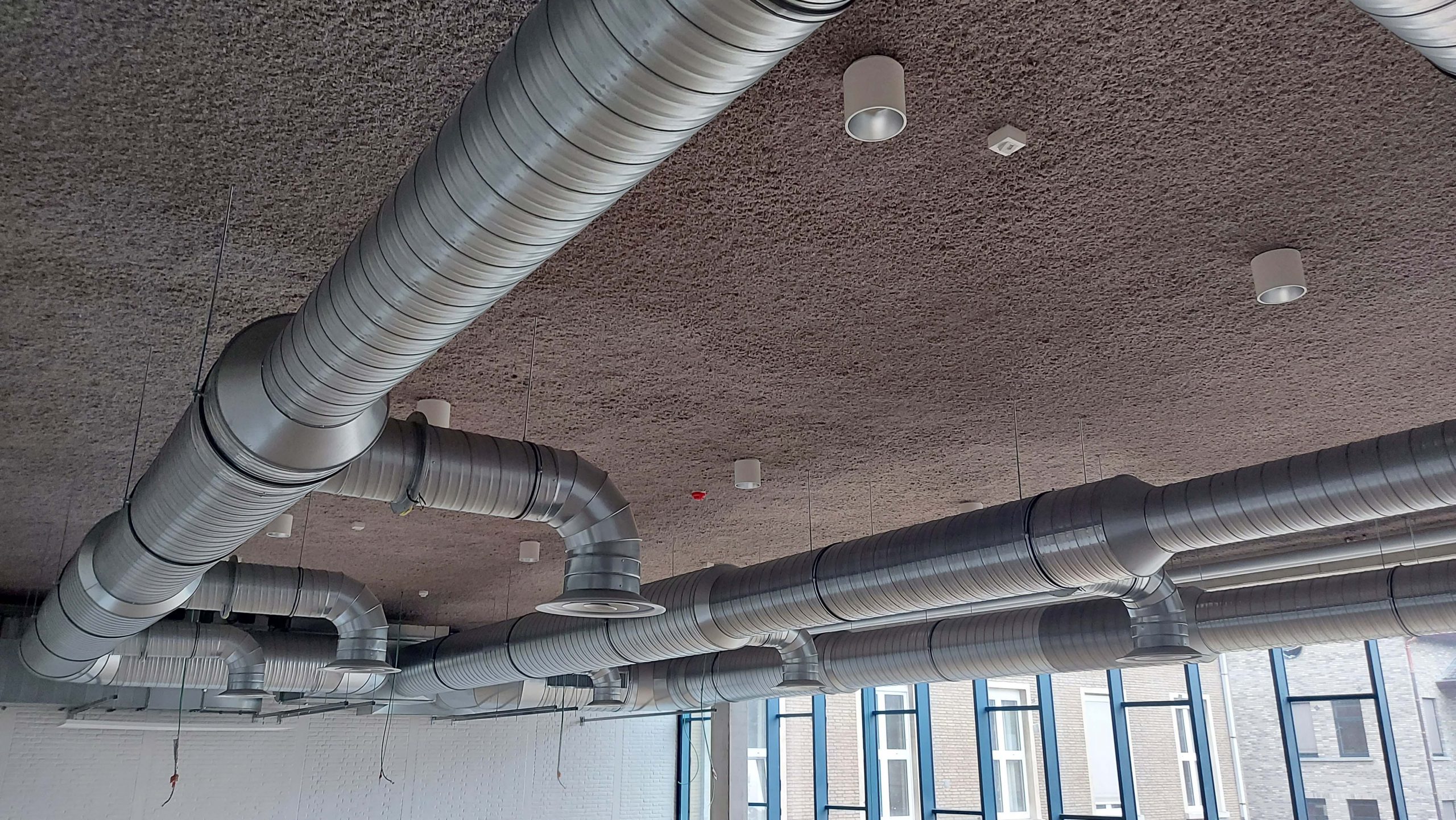 Gedetailleerd zicht op het plafond met akoestische spuitpleister in het kantoor van Carton123 architecten Brussel